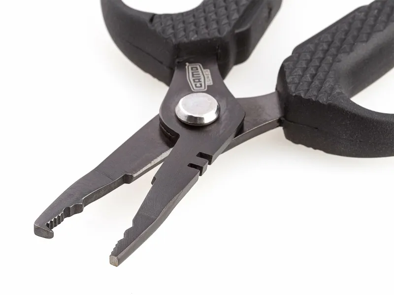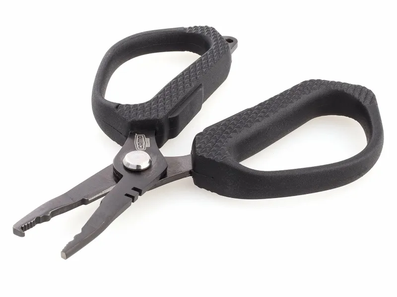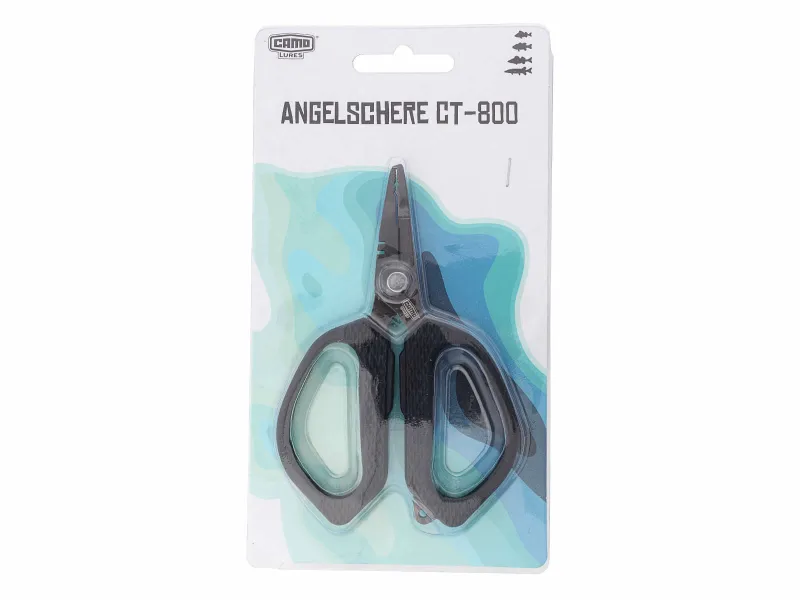 Die CAMO Lures Angel-Schere CT-800 ist eine beidhändig verwendbare Schere, die monofile und geflochtene Schnüre sauber schneidet. Außerdem lassen sich mit ihr Sprengringe wechseln und Hardbait-Ösen nachjustieren. Das Griffmaterial liegt auch mit nassen Händen angenehm in der Hand und an der Öse lässt sich z.B. gut ein Lanyard befestigen.