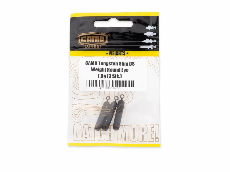 Die CAMO Tungsten Slim Drop Shot Weight Round Eye sind zylindrische Gewichte mit einer runden Öse, die perfekt für das Free Rig, Jika Rig und das Drop Shot Rig geeignet sind. Sie sind etwa 50% kleiner als vergleichbare Bleigewichte, da sie aus hartem Material (98% Tungsten) gefertigt sind. Dies ermöglicht es, den Gewässergrund sehr präzise zu spüren. Einmal den Unterschied zu Tungsten gespürt zu haben, wird Sie immer dazu bringen, Tungsten zu verwenden! Die matte schwarze Farbe wurde bewusst gewählt, um den Fokus der Fische auf den Gummiköder zu lenken. Silberne, glänzende Drop Shot Gewichte ziehen oft die Aufmerksamkeit der Räuber an und führen zu vielen "Fehlbissen".